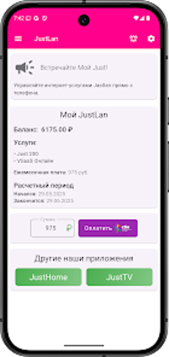 Applikationen «Мой Just» erbjuder en praktisk lösning för användare av JustLan, vilket gör det möjligt att hantera sina tjänster direkt från en Android-enhet. Användarna kan enkelt övervaka sitt kontos status, betala för tjänster och justera inställningar för att optimera sin användarupplevelse. Appen är gratis och designad för att underlätta kommunikationen med internetleverantören.